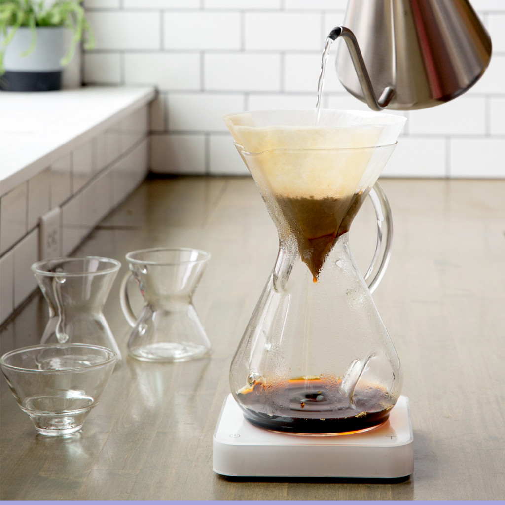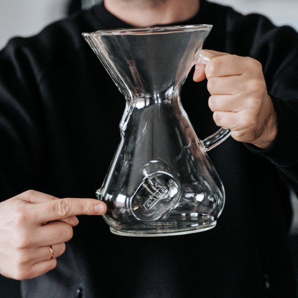 Miután elkészült a kívánt mennyiségű kávé, emeld le és dobd ki a használt filtert. A CHEMEX filterpapírjai lebomlók és komposztálhatók.