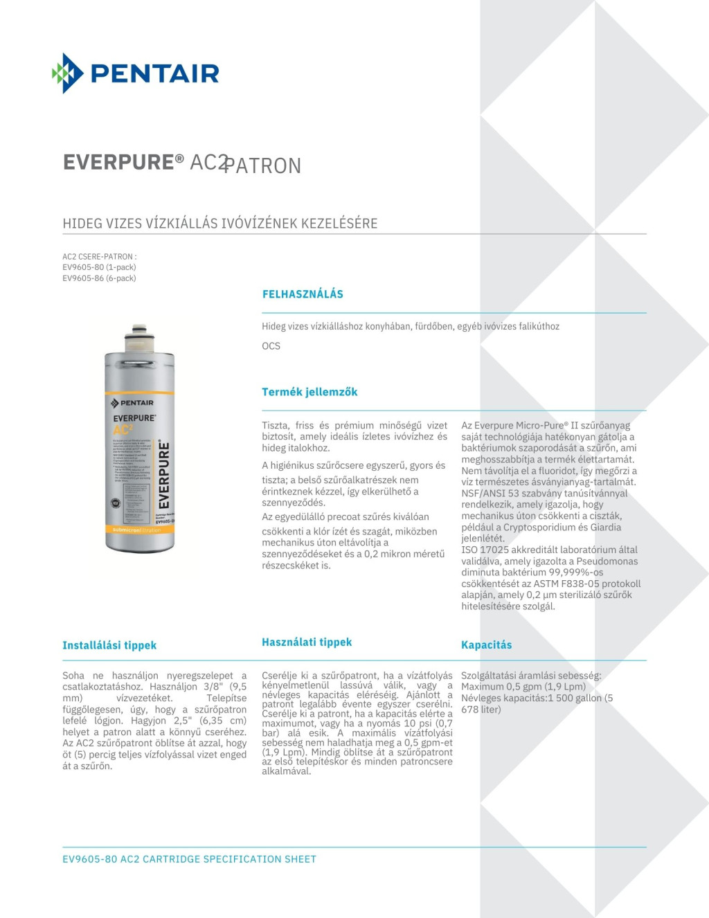 A Pentair Everpure AC2 vízszűrő betét egy fejlett és megbízható megoldás, amely a modern víztisztítás legújabb technológiáját kínálja. Ez a betét tervezésénél a hatékonyság és a minőség volt az elsődleges szempont, hogy minden felhasználó számára tiszta, kellemes ízű és egészséges vizet biztosítson.